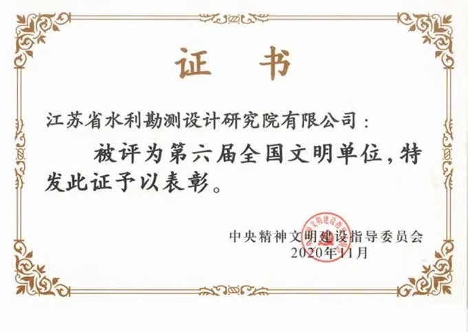 江苏省水利勘测设计研究院有限公司(原江苏省水利勘测设计院,以下简称“江苏水院”)成立于1957年,原为江苏省水利厅下属事业单位,2004年在全国同行业中率先建立现代企业制度。多年来,在江苏省水利厅党组、水利行业党委和地方党委、政府的关心支持下,江苏水院党委和董事会、经营层始终坚持以经济建设为中心,以文明创建为抓手,突出政治引领,涵育企业文化,履行社会责任,服务绿色发展,为企业高质量发展提供强大的精神动力和道德支撑,为加快推进江苏水利现代化和社会经济发展提供了坚强技术支撑,努力打造具有鲜明特征的新时代新型水利勘测设计企业。江苏水院先后于2001年、2007年和2017年获得“扬州市文明单位”“江苏省文明单位”和“全国水利文明单位”称号。2020年,江苏水院再接再厉,成功创建第六届“全国文明单位”。